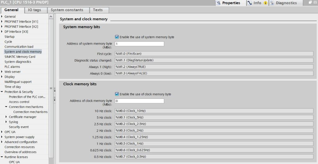 En Siemes, a diferencia de Mitsubishi donde el area de memoria de los System Relays (SM) está fija y siempre activa, hay que habilitar los System memory bits y los Clock memory bits, además de que es posible también elegir las direcciones de los bytes en los cuales queremos ese comportamiento. Por default, el MB1 se usara para los System memory bits, y el MB0 para los Clock memory bits.