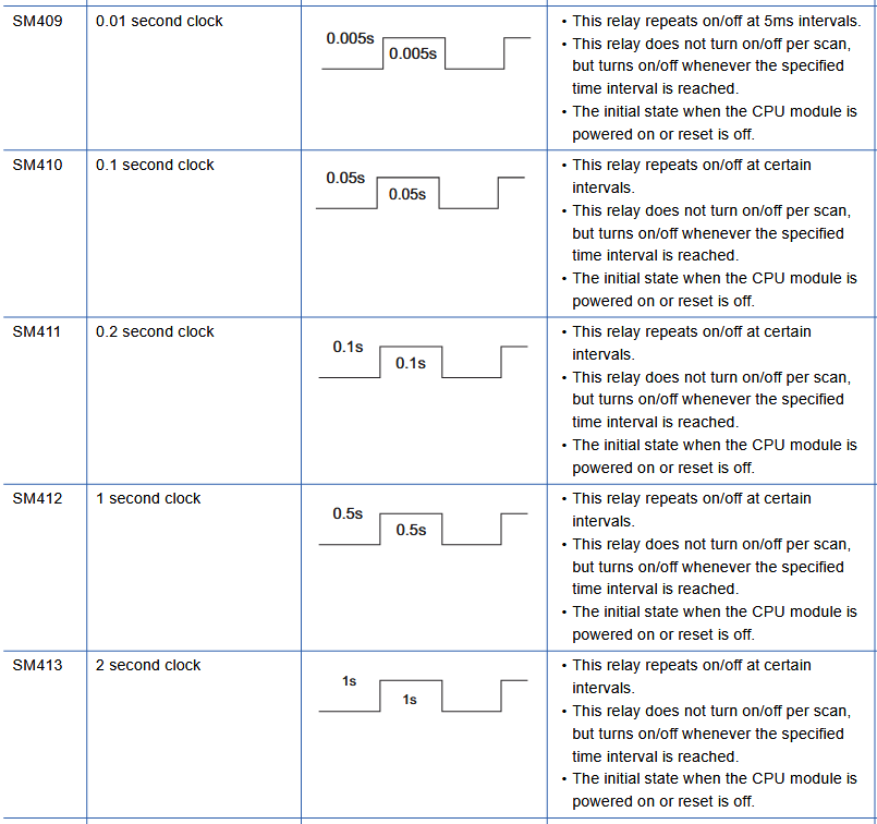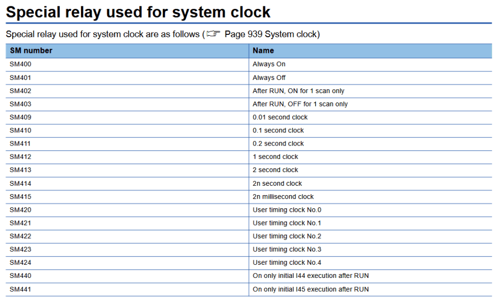 Mitsubishi se va por lo predefinido y directo. Ya sabes de memoria que SM400 siempre será “always true” y que SM413 parpadea con una frecuencia de 0.5 Hz.